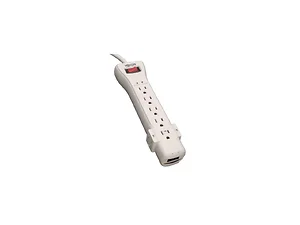 Surge suppressor offers complete AC and phone line surge suppression for comprehensive protection of workstations, desktop PCs, telecom systems and other sensitive electronics. Heavy-grade, AC surge suppression shields connected equipment from damage and performance problems due to transient surges. Set of RJ11 telephone line suppression jacks protects dialup and DSL modem lines, fax machines, cordless phones and more. SUPER7TEL offers seven total outlets, 7' cord with space-saving angled plug and diagnostic LEDs to warn of wiring problems and suppressor damage. Heavy-grade AC suppression rated at 2520 joules shields equipment from surges and line noise. Light gray suppressor housing with keyhole mounting tabs and three designated transformer plug outlets offers convenient protection of desktop computer equipment and accessories. Built-in power switch and 15 amp circuit breaker offer power control and overload protection over all outlets.
