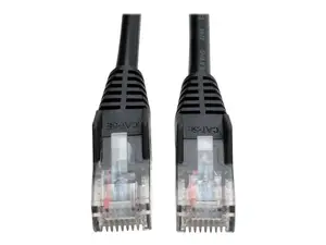 Tripp Lite's 10-ft. (3.05 m) black snagless category 5e (Cat5e) patch cable has 2 snagless RJ45 molded male connectors featuring integral strain relief. The cable is manufactured from PVC 4-pair stranded UTP and is rated for 350MHz/1Gbps communication. All cables are offered in a variety of lengths and colors for all category 5 (Cat5) and 5e cabling needs. Standard category 5e patch cables are also available.