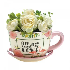 Bring a touch of tropical charm to your home with the Pink Flamingo Teacup Planter. Perfect for small plants, this delightful planter adds an artistic flair to any space. With its whimsical design featuring flamingoes and vibrant flowers, this planter is sure to brighten your day.