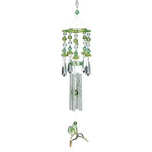 Cheerful wind chimes have cascading acrylic crystals with a hummingbird pendant at the bottom. Silver pipes make music in the wind. Small size is a great choice for smaller patios or yards. 0.1 pound. 2.5 inches in diameter x 13 inches long. Metal and acrylic.
