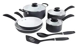 This eco-friendly 10-piece Cookware set features a non-stick white ceramic interior. The handles are black soft-touch. The aluminum construction provides superior heat conduction and is lightweight for easy handling. PTFE & PFOA-free, made of aluminum alloy core, ceramic coated non-stick surface. Aluminum, Non-Stick Ceramic. Grey exterior, White interior. Dishwasher safe.