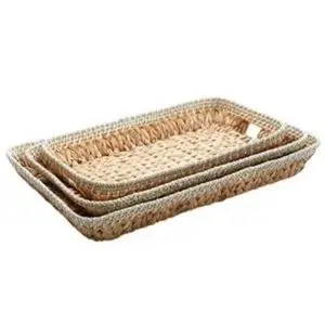 Serve your guests with the rustic, natural beauty of the eco-friendly Dallington 3-piece serving tray set. These rectangular serving trays are made of woven water hyacinth that retains their natural color. Perfect for serving bread and snacks, these trays bring a green option to your kitchen. Compact rectangular design, nest for easy storage, the pieces measure 22.75 x 15 x 3, 20.85 x 13 x 3, 18.85 x 11 x 3, cutout handles.