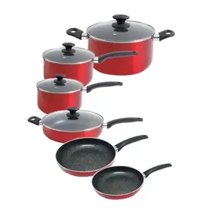 Oster 10 pc cookware nonstick 3.0mm - 1qt sauce with lid, 2.5 qt sauce with lid, 5qt Dutch oven with lid, 3.5 qt saute with lid, 1 8 in frypan, 1 9,5 in frypan, Bakelite handles on each , Black speckled interior 3.0 alum.