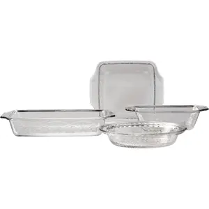 Glass tempered tougher. Temperature and shatter resistant glass plus recessed handles allow you to go freezer-to-oven, oven-to-table, and table-to-dishwasher with the worry-free baking dishes. These baking dishes are microwave, dishwasher, freezer, and pre-heated oven safe. Tempered glass will not warp, stain, retain smells, or leach dangerous chemicals into food. This bakeware set is perfect for baking desserts, casseroles, meats, fishes, and much more. Experimental creations or traditional recipes ? these baking dishes are built to handle it all. this set includes: 4 qt. Laurel Embossed? Bake Dish, 8 in Sq Laurel Embossed? Cake Dish, 1.5 qt. Laurel Embossed? Loaf Dish, 9.5 in Laurel Embossed? Pie DishAnchor Hocking Glass Bakeware is oven-safe and family-tested. Stronger than regular glass products, you can bake and serve with the confidence that this tempered product won't let you down. Test their versatility with scrumptious, savory, or sweet, these dishes won't stain or absorb odors. Sleek yet sturdy, their dishwasher safety also saves you time by removing the majority of the hassle of cleaning. Made entirely in the USA, the care of their production is perhaps only eclipsed by the durability of their use.