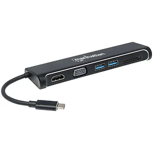 The Manhattan SuperSpeed USB-C to HDMI/VGA 4-in-1 Docking Converter establishes a fast, simple and convenient link between newer USB type-C equipped media sources and existing HDMI/VGA displays, in either mirror- or extended-display mode. Create a mini-workstation by adding any USB 3.0 peripheral such as a mouse, keyboard, hub, external memory device and more with the integrated USB 3.0 ports and SD Card slot.