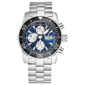 Revue Thommen 17030.6125 Men's 'Divers' Blue Dial Day-Date Chronograph Automatic Watch Revue Thommen 17030.6125 Men's 'Divers' Blue Dial Day-Date Chronograph Automatic Watch features a stainless steel 45mm case, with a uni-directional bezel, a blue dial and a scratch resistant sapphire crystal. The 22mm stainless steel band is fitted with a deployment clasp. This beautiful wristwatch, powered by Automatic movement. This watch has a water resistance of up to 1000 feet/300 meters, suitable for recreational swimming, diving and snorkeling. Features: Brand: Revue Thommen Model number: 17030.6125 Case Shape: Round Dial window material type: Sapphire Display Type: Analog Clasp: Deployment Case material: Stainless steel Case diameter: 45 millimeters Case Thickness: 16 millimeters Band Material: Stainless Steel Band length: 8 inches Band Width: 22 millimeters Band Color: Silver-tone Dial color: Blue Bezel material: Stainless Steel Bezel function: Uni-directional Movement: Automatic Special Features: Chronograph Water resistant depth: 300 meters UPC: Revue Thommen 17030.6125 MSRP: $ 3250