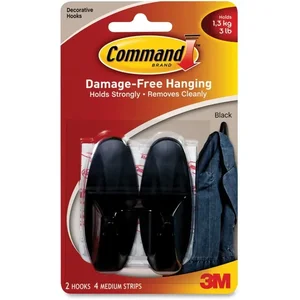 <div><b>General Information</b><hr/><span>Manufacturer</span>:3M<br/><span>Manufacturer Part Number</span>:17081BLKES<br/><span>Manufacturer Website Address</span>:http://www.3m.com<br/><span>Brand Name</span>:Command<br/><span>Product Name</span>:Medium Designer Hooks<br/><span>Marketing Information</span>:<p>Forget about nails, screws and tacks. Command Designer Hooks offer a fast, easy way to hang and hold a surprising amount of weight. Command Adhesive sticks to many surfaces, including paint, wood, tile and more, yet comes off leaving no holes, marks, sticky residue or stains. Rehanging is as easy as applying a Command Refill Strip so you can take down, move and reuse them again and again. Bilingual packaging is printed in English and Spanish.</p> <p><br/><span>Packaged Quantity</span>:2 / Pack<br/><span>Product Type</span>:Hook<br/></div><div><b>Product Information</b><hr/><span>Total Number of Hooks</span>:2<br/><span>Weight Capacity</span>:8 oz (226.8 g)<br/></div><div><b>Physical Characteristics</b><hr/><span>Color</span>:Black<br/></div><div><b>Miscellaneous</b><hr/><span>Recycled</span>:No<br/><span>Assembly Required</span>:No<br/><span>Country of Origin</span>:United States<br/></div>