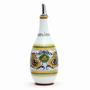 The Raffaellesco Oil and Vinegar Bottle features a beautiful and timeless design, inspired by the classic Italian majolica patterns dating back to the 16th century. The central motif, showcasing the stylized dragon, is a nod to the legendary artist Raphael and is believed to bring good fortune and fair winds to sailors. Each bottle is meticulously handcrafted and hand-painted in Deruta, Italy, making it a unique addition to your kitchen or dining table.