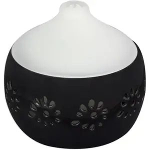The Spa Pro Black Ceramic Diffuser has a unique shape and design. It is 5.9" wide by 5.1" tall, operates 3-4 hours, holds up to 3.38 ounces of water and offers 4 operational settings. It has 3 auto changing LED colors (optional) and is perfect for any room for use with or without essential oils. Includes Base/Ceramic cover, Power cord; Ceramic/Plastic Black finish.