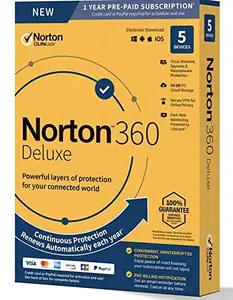 Norton 360 Deluxe provides robust, all-in-one protection for up to 5 devices, integrating advanced security features to safeguard your online activity and personal information. Enjoy peace of mind with features designed to combat malware, secure your online transactions, and optimize device performance.