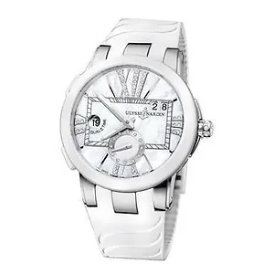 ULYSSE NARDIN 243-10/391 Executive Dual Time Automatic Ladies Watch The Silver-tone stainless steel case with a white leather strap. Fixed white ceramic bezel. Mother of pearl dial with luminous silver-tone hands and index hour markers. Diamond-filled roman numeral hour markers. Dial Type: Analog. Luminescent hands. Date display at the 2 o'clock position. One subdial displaying: small second. Ulysse Nardin Calibre UN-24 Automatic movement, containing 34 Jewels, bitting at 28800 vph, and has a power reserve of approximately 42 hours. Scratch resistant sapphire crystal. Screw down crown. Transparent case back. Round case shape, case size: 40 mm, case thickness: 12.8 mm. Band width: 25 mm. Fold over with push button release clasp. Water resistant at 50 meters / 165 feet. Functions: GMT, second time zone, date, hour, minute, second. Executive Dual Time Series. Luxury watch style. Watch label: Swiss Made. Ulysse Nardin Executive Dual Time Automatic Ladies Watch 243-10/391. Features: Brand: Ulysse Nardin l Series: Executive Dual Time Gender: Ladies Model: 243-10/391 Watch Label: Swiss Made Movement: Automatic Case Size: 40 mm Case Thickness: 12.8 mm Case Material: Stainless Steel Case Color: Silver-tone Case Shape: Round Case Back: Transparent Band Material: Leather Band Type: Strap Band Color: White Band Width: 25 mm Clasp: Fold Over with Push Button Release Dial Color: Mother of Pearl Type: Analog Crystal: Scratch Resistant Sapphire Hands: Luminous Silver-tone Dial Markers: Index Second Markers: Diamond-filled Roman Numeral Hour Markers Bezel: Fixed Bezel Color: White Bezel Material: Ceramic Crown: Screw Down Water Resistance: 50 meters / 165 feet