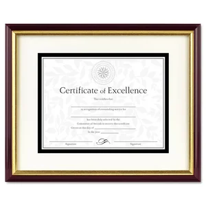 This elegant document frame is designed to showcase your certificates and achievements beautifully. It features a rich mahogany finish complemented by a gold mat. Perfect for any setting, it fits 11 x 14 inch documents or 8 1/2 x 11 inch certificates.