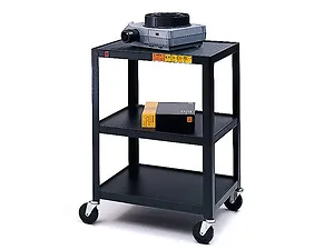 This sturdy AV cart is designed for optimal organization and mobility in any educational or professional setting. With a height of 34 inches and multiple shelves, it is perfect for accommodating various audiovisual equipment such as TVs, projectors, and VCRs. The cart is constructed from durable steel and features a sleek black powder-coated finish that complements any environment.