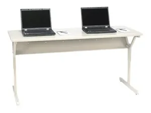 This adjustable work center features a spacious rectangular gray top surface with quartz trim, making it ideal for school environments. The console frame design ensures sturdiness and style, while the adjustable height offers flexibility for various tasks.