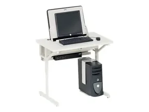 The Bretford CONNECTIONS SmartDeck is a versatile table designed for educational environments. It features an adjustable height, allowing users to customize their workspace from 24 inches to 32 inches. The gray, rectangular top surface is made of high-pressure laminate, providing durability and ease of maintenance. The console frame base and powder-coated steel legs ensure stability and can accommodate various user needs. With integrated cable management and a CPU slim holder, the SmartDeck keeps your workspace organized and efficient.