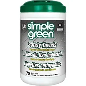Safety Towels are larger-sized wipes for heavy-duty, multipurpose cleaning. They are pre-moistened with Crystal Simple Green, a powerful cleaner and degreaser that is nontoxic, nonabrasive and noncorrosive. The durable, dual-sided wipes feature a scouring side for tough scrubbing and a smooth side for a nonabrasive, lint-free shine. The wipes feature excellent wicking and fluid-holding capacity for cleaning liquid spills and are thermally bonded and melt-blown to ensure durability and resistance to rot and mildew. Easily remove grease, oil, food spills, wet paint, carbon, graphite, tar, soot, grime, most inks and more. They are safe for use on all washable surfaces including metals, concrete, rubber, finished wood, tile, laminates, concrete, stone, porcelain, carpets and other industrial surfaces. The cleaning solution contains no added color or scent and is NSF-registered for use in food-processing facilities and commercial kitchens.