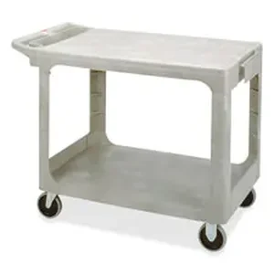 The Heavy-Duty Beige Utility Cart is designed for durability and versatility. With its robust structural foam construction, this cart resists rust and corrosion, making it perfect for both indoor and outdoor use. It features a spacious flat shelf design that can easily transport various items, from tools to supplies, while its locking casters provide stability and control during movement.