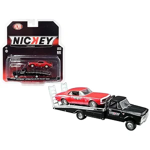 Brand new 1/64 scale diecast car models of 1967 Chevrolet C-30 Ramp Truck Black with 1967 Chevrolet Camaro Red "Nickey Performance" "Acme Exclusive" die cast model cars by Greenlight for ACME.