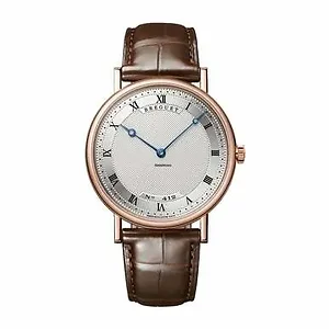 Breguet 5157BR119V6 Classique Ultra Slim 18kt Rose Gold Case Silver Dial Brown Leather Watch The Breguet 5157BR119V6 Classique Ultra Slim 18kt Rose Gold Case Silver Dial Brown Leather Watch features p olished 18kt rose gold case with Breguet signature coined case band, a s ilver dial with a very fine guilloche textured pattern finish and f lat silver chapter ring with black printed Roman Numeral hour markers. The 20mm brown leather is fitted with a tang buckle clasp. This beautiful wristwatch is powered by automatic movement and water resistant up to 30 meters. Features: Brand: Breguet Series: Heritage Model number: 5157BR119V6 Case Shape: Round Dial window material type: Scratch Resistant Sapphire Display Type: Analog Clasp: Tang buckle Case material: 18kt Rose Gold Case diameter: 38 millimeters Case Thickness: 5.4 millimeters Band Material: Leather Band length: Men's Standard Band Width: 20 millimeters Band Color: Brown Dial color: Silver Bezel material: 18kt Rose Gold Bezel function: Fixed Movement: Automatic Water resistant depth: 30 meters Breguet 5157BR119V6 MSRP: $18800