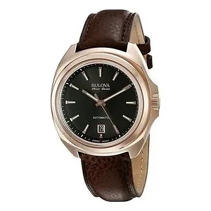 Rich hues of brown and rose-tone in a reptile print genuine leather strap and a polished stainless steel case make this Bulova 64B126 Accu Swiss watch a luxurious addition to any gentleman's collection. A reinterpretation of late-1960s Bulova design, with faceted cases offering a subtle echo of the signature tuning fork shape, the Bulova Accu Swiss Telc Collection is named after the exquisite Moravian town known for its Renaissance and Baroque architecture. The Bulova 64B126 Accu Swiss Telc watch is crafted of solid stainless steel with Swiss automatic movements. With classic marquis bracelets or leather straps, each features a double-curve sapphire box crystal with anti-reflective coating, super luminescent hands and markers, a custom-engineered, curved seven-screw case back for wearing comfort, double-press Deployment closure, and water resistance to 30 meters. Features: Brand: Bulova Model Number: 64B126 Item Shape: Round Dial window material type: Anti reflective sapphire Display Type: Analog Clasp Type: Deployment clasp with push button Case material: Stainless Steel Case diameter: 42mm Case Thickness: 13mm Band Material: Leather calfskin Band length: Men's standard Band Width: 20mm Band Color: Brown Dial color: Black Bezel material: Stainless steel Bezel function: Stationary Calendar: Date Movement: Swiss Automatic Water resistant depth: 30m UPC: 042429514553 Bulova 64B126 MSRP: $1250