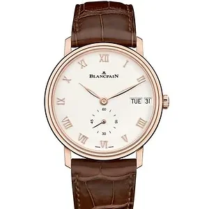 Blancpain 6652-3642-55B Villeret Ultra Slim White Dial 18kt Rose Gold Case Brown Leather Watch The Blancpain 6652-3642-55B Villeret Ultra Slim White Dial 18kt Rose Gold Case Brown Leather Watch with an extra thin design is a perfect accompaniment to a stylish look. The round 40mm case of 10.4mm thickness is performed in 18K rose gold. The white dial has polished steel leaf-shaped and skeletonized hands. The hour markers are presented by applied Roman Numerals of rose gold. The timepiece is fitted on a brown alligator strap with a deployant buckle. It is 30m water resistant. Features: Brand: Blancpain Series: Villeret Ultra Slim Model number: 6652-3642-55B Case Shape: Round Dial window material type: Scratch Resistant Sapphire Display Type: Analog Clasp: Deployment Buckle Case material: 18kt Rose Gold Case diameter: 40 millimeters Case Thickness: 10.4 millimeters Band Material: Alligator Leather Band length: Men's Standard Band Width: 20 millimeters Band Color: Brown Dial color: White Bezel material: 18kt Rose Gold Bezel function: Stationary Movement: Automatic Water resistant depth: 30 meters Calendar: Date, Day Blancpain 6652-3642-55B MSRP: $20500