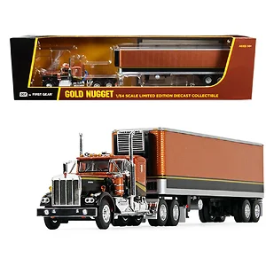 This meticulously crafted 1/64 scale diecast model represents the iconic Kenworth W900A, complete with a 36-inch Flattop Sleeper Cabin and a 40-foot Vintage Refrigerated Reefer Trailer, beautifully finished in Gold Nugget with striking black accents.