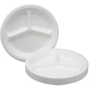 Disposable plates made of molded pulp paper provide extra resistance to water and grease. Each offers triple compartments to separate food. Plates are waterproof, tasteless, odorless and grease-resistant. Flat-bottom nesting meets FDA requirements. Each plate contains 99 percent post-consumer material.