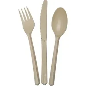 Three-piece dining set of bio-based resin cutlery uses wheat to replace 50 percent of polypropylene, allowing the flatware to compost by 50 percent within 90 days. Bio-based cutlery will maintain its durability when immersed in temperatures exceeding 200 degrees Fahrenheit. Cutlery meets or exceeds all current performance standards. Three-piece set includes knife, fork and spoon.