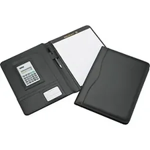 Portfolio offers leather-look cover, inside pocket and solar-powered eight-digit calculator with rubber keys. Portfolio also includes a ruled, letter-size writing pad; a retractable, antimicrobial pen with a rubberized grip; and pen loop.