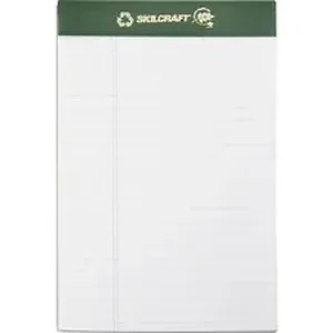 Perforated writing pads are made using a 100 percent chlorine-free manufacturing process and certified by the Chlorine Free Association. Chlorine and its derivatives have proven to be very harmful to the environment, especially aquatic life. These pads feature a green leatherette strip embossed with both gold SKILCRAFT and recycle logos. Each pad contains 50 ruled sheets (5/16" line spacings) of a 20 lb. basis weight paper attached to a sturdy .050 cal backer board. Pads meet Executive Orders 13514 and 13423.