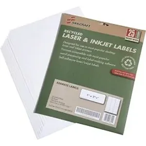 Environmentally friendly address labels offer a face sheet that is made using 100 percent recycled post-consumer fiber and is processed chlorine-free (PCF). The adhesive meets the USPS specification USPS-2-1238 so it can be safely recycled. Labels are both acid-free and lignin-free, making them safe for archiving. Labels will not yellow. Labels are compatible with both desktop laser and inkjet printers. Each sheet has 30 labels. Product packaging is made using 100 percent post-consumer material.