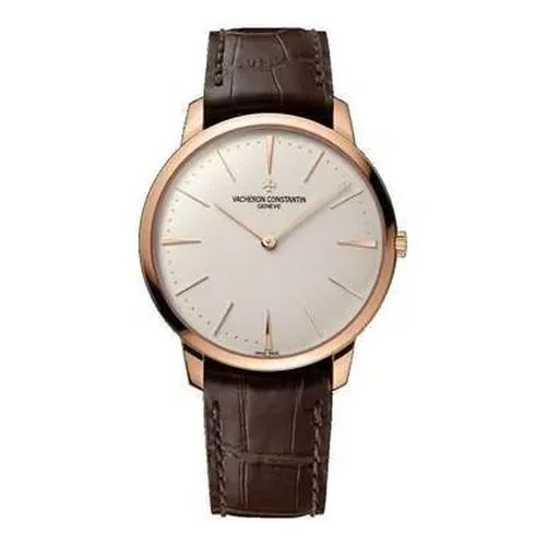 Vacheron Constantin 81180/000R-9159 Patrimony Manual Wind Leather Men's Watch This 18K pink gold watch combines purity of design with the essence of timekeeping. Inspired by the watches of the 1950s, the hands gently follow the curve of the dial. Its slim case, just 6.80 millimeters thick, has a solid back allowing the watch to be personalized with the owner's choice of engraving. Its manually-wound movement is stamped with the Hallmark of Geneva, a guarantee of excellence and reliability. Features: Brand: Vacheron Constantin Series: Patrimony Gender: Men's Watch Label: Swiss Made Movement: Hand Wind Case Size: 40 mm Case Thickness: 6.7 mm Case Material: 18kt Pink Gold Case Shape: Round Case Back: Solid Band Material: Alligator Leather Band Type: Strap Band Color: Brown Clasp: Tang Dial Color: Silver Type: Analog Crystal: Scratch Resistant Sapphire Hands: Pink Gold Dial Markers: Index Second Markers: Minute Markers around the outer rim Bezel: Fixed Bezel Material: 18kt Pink Gold Crown: Pull / Push Water Resistance: 30 meters / 100 feet