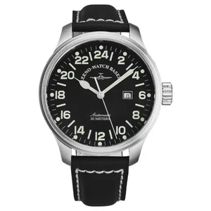 Zeno 8563-24-A1 Men's 'Pilot' 24 hours Limited Edition Black Dial Black Leather Strap Automatic Watch Zeno 8563-24-A1 Men's 'Pilot' 24 hours Limited Edition Black Dial Black Leather Strap Automatic Watch features a stainless steel 47.5mm case, with a fixed bezel, a black dial and a scratch resistant sapphire crystal. The 22mm leather band is fitted with a tang clasp. This beautiful wristwatch, powered by Swiss automatic movement. This watch has a water resistance of up to 100 feet/30 meters, suitable for recreational swimming, not for diving and snorkeling. Features: Brand: Zeno Model number: 8563-24-A1 Case Shape: Round Dial window material type: Scratch Resistant Sapphire Display Type: Analog Clasp: Tang Case material: Stainless steel Case diameter: 47.5 millimeters Case Thickness: 15.5 millimeters Band Material: Leather Band length: 8 millimeters Band Width: 22 millimeters Band Color: Black Dial color: Black Bezel material: Stainless Steel Bezel function: Fixed Movement: Automatic Water resistant depth: 30 meters UPC: 7640172570296 Zeno 8563-24-A1 MSRP: $ 1995