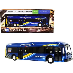 This detailed diecast model of the Proterra ZX5 Electric Transit Bus, designated as #B32, represents the MTA New York City design in a striking dark blue with stripes. Perfect for collectors and enthusiasts alike, this 1/87 scale model showcases the commitment to sustainability in urban transit.