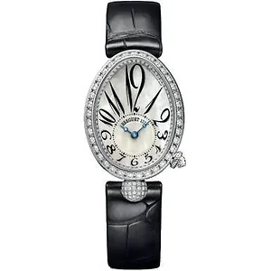 Breguet Reine de Naples White Gold Automatic Ladies Watch 8928BR5W944DD0D Breguets Reine de Naples collection is inspired by an early bracelet watch A.-L. Breguet created for Bonapartes sister Caroline, Queen of Naples. With their customary care and precision, Breguets watchmakers have created a symbol of feminine refinement in a contemporary jewellery watch. Case in 18k rose gold, cambered ovoid with delicately fluted caseband. Brand : Breguet Model : 8928BR5W944DD0D Gender : Women Movement : Automatic Case Shape : Oval Case Size : 24.95Mm x 33mm Case Thickness : 8.50Mm Case Material : 18kt white gold Crystal : Sapphire crystal Dial : Mother of pearl Dial Color : Mother of pearl Dial Numerals : Arabic numerals Band Material : Crocodile skin Band Color : Black Water Resistance : 30m/100ft Clasp : Deployant buckle Clasp Notes : Set with 26 diamonds weighing +/- 0.12Ct