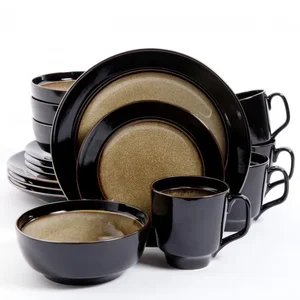 The Gibson Elite Bella Galleria 16-piece Dinnerware Set in taupe/black is the perfect set for a family of four. Bold designs for the bold at heart. Traditional finishing techniques produce differences in color, size and texture, ensuring no two pieces are exactly alike. Taupe/Black Reactive Glaze Stoneware. This sixteen piece set by Gibson includes 4 dinner plates, 4 salad plates, 4 bowls & 4 mugs. Dishwasher and Microwave Safe.