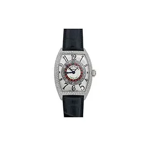 FRANCK MULLER 9880-Vegas-D-7 Casablanca Silver Dial Automatic Men's Luxury Watch The White gold case with a black crocodile leather strap. Fixed diamond set bezel. Silver dial with black hands and Arabic numeral hour markers. Dial Type: Analog. Automatic movement. Scratch resistant sapphire crystal. Solid case back. Tonneau case shape. Case size: 60 mm x 43 mm. Tang clasp. Functions: hour, minute. Additional Info: case loaded with 7 rows of diamonds. Luxury watch style. Watch label: Swiss Made. Item Variations: 9880 VEGASD7, 9880.VEGASD7, 9880VEGASD7. Franck Muller Casablanca Silver Dial Automatic Men's Luxury Watch 9880-Vegas-D-7. Features: Brand: Franck Muller Series: Casablanca Gender: Men's Model: 9880-Vegas-D-7 Watch Label: Swiss Made Movement: Automatic Case Size: 60 mm x 43 mm Case Material: White Gold Case Shape: Tonneau Case Back: Solid Band Material: Crocodile Leather Band Type: Strap Band Color: Black Clasp: Tang Dial Color: Silver Type: Analog Crystal: Scratch Resistant Sapphire Hands: Black Dial Markers: Arabic Numeral Bezel: Fixed Bezel Material: Diamond Set