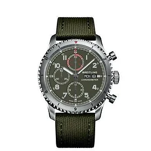 Breitling Aviator 8 Chronograph 43 Curtiss Warhawk Stainless Steel With Green Fabric Automatic Mens Watch A133161A1 Stainless steel case with a khaki green fabric strap. Bi-directional rotating stainless steel bezel. Green dial with luminous green hands and Arabic numeral hour markers. Minute markers around the outer rim. Dial Type: Analog. Luminescent hands and markers. Day of the week and date display at the 3 o'clock position. Brand : Breitling Series : Chronograph Model : A133161A1 Gender : Men's Watch Label : Swiss made Movement : Automatic Case Diameter : 43mm Case Material : Stainless steel Case Shape : Round Bezel : Bi-directional rotating Crown : Screw locked Dial Type : Analog Crystal : Scratch resistant sapphire Hands : Luminous green hands Dial Markers : Arabic Band Type : Strap Band Color : Green Band Material : Fabric Clasp : Buckle Water Resistance : 100 meters / 330 feet Calendar : Date display at the 3 o'clock position Functions : Chronograph, date, hour, minute, second
