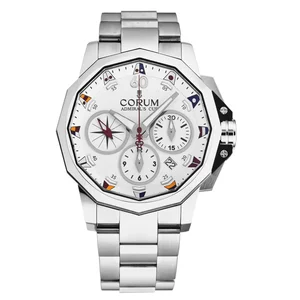 Corum Men's A753/04235 'Admiral Cup' Silver Dial Stainless Steel Bracelet Automatic Watch The Corum Men's A753/04235 'Admiral Cup' Silver Dial Stainless Steel Bracelet Automatic Watch features a stainless steel 44mm case, with a stationary bezel, a silver tone dial and a sapphire crystal . The stainless steel band is fitted with a deployant clasp. This beautiful wristwatch is powered by Corum ETA 7753 automatic movement. This watch has a water resistance of up to 100 meters, suitable for short periods of recreational swimming, but not diving or snorkeling. Features: Brand: Corum Model number: A753/04235 Dial Shape: Round Dial window material type: Sapphire Display Type: Analog Case material: Stainless Steel Clasp: Deployant Case diameter: 44 millimeters Case Thickness: Band Material: Stainless Steel Band length: Men's Standard Band width: Band Color: Silver tone Dial color: Silver tone Bezel material: Stainless Steel Bezel function: Stationary Special features: Chronograph Calendar: Date display between 4 and 5 o'clock Movement: Automatic Water resistant depth: 100 meters/330 feet UPC: Corum A753/04235 MSRP: $9,500