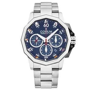 Corum Men's A753/04237 'Admiral Cup' Chronograph Blue Dial Stainless Steel Bracelet Automatic Watch The Corum Men's A753/04237 'Admiral Cup' Chronograph Blue Dial Stainless Steel Bracelet Automatic Watch features a stainless steel 44mm case, with a fixed bezel, a blue dial and a sapphire crystal . The stainless steel band is fitted with a deployment clasp. This beautiful wristwatch is powered by Corum Calibre CO 753 automatic movement. This watch has a water resistance of up to 100 meters, suitable for short periods of recreational swimming, but not diving or snorkeling. Features: Brand: Corum Model number: A753/04237 Dial Shape: Round Dial window material type: Sapphire Display Type: Analog Case material: Stainless Steel Clasp: Deployment Case diameter: 44 millimeters Case Thickness: 16 millimeters Band Material: Stainless Steel Band length: 8 inches Band width: 22 millimeters Band Color: Silver tone Dial color: Blue Bezel material: Stainless Steel Bezel function: Fixed Special features: Chronograph Calendar: Date between 4 and 5 o'clock position Movement: Automatic Water resistant depth: 100 meters/330 feet UPC: Corum A753/04237 MSRP: $9,500