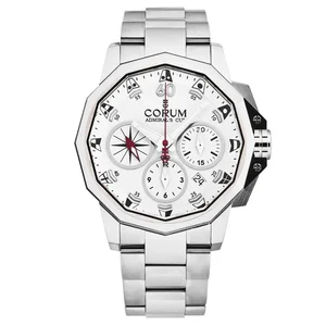 Corum Men's A753/04257 'Admiral Cup' Chronograph White Dial Stainless Steel Bracelet Automatic Watch The Corum Men's A753/04257 'Admiral Cup' Chronograph White Dial Stainless Steel Bracelet Automatic Watch features a stainless steel 44mm case, with a fixed bezel, a white dial and a sapphire crystal . The stainless steel band is fitted with a deployment clasp. This beautiful wristwatch is powered by Corum Calibre CO 753 automatic movement. This watch has a water resistance of up to 100 meters, suitable for short periods of recreational swimming, but not diving or snorkeling. Features: Brand: Corum Model number: A753/04257 Dial Shape: Round Dial window material type: Sapphire Display Type: Analog Case material: Stainless Steel Clasp: Deployment Case diameter: 44 millimeters Case Thickness: 16 millimeters Band Material: Stainless Steel Band length: 8 inches Band width: 22 millimeters Band Color: Silver tone Dial color: White Bezel material: Stainless Steel Bezel function: Fixed Special features: Chronograph Calendar: Date between 4 and 5 o'clock position Movement: Automatic Water resistant depth: 100 meters/330 feet UPC: Corum A753/04257 MSRP: $9,500