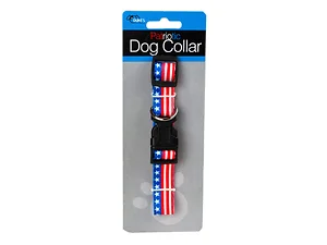 Show off you and your pet's American pride with this Patriotic Dog Collar featuring a fun red, white and blue design that reflects the look of the United States flag. Great for wearing on the 4th of July, this collar is made with sturdy nylon and has a plastic side squeeze latch and a metal hook so leashes can easily clip on. Collar is adjustable and can expand up to 20" long. Collar is approximately 3/4" wide. Comes in assorted styles. Comes packaged to a tie card.