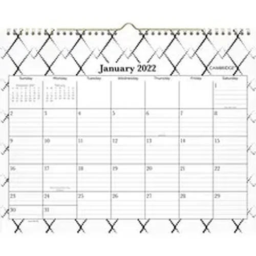 Hang this Cambridge Makenzie Wall Calendar to keep the date in view and enjoy the stylish geo design that borders each page. Dated planning pages range 12 months from January to December. One-page-per-month format features ruled daily squares (2-13/16" x 2-13/16") for neat scheduling of events, plans and reminders as well as past and future reference calendars for convenient date checking. Gold twin-wire binding includes a built-in hanging loop for easy wall display.