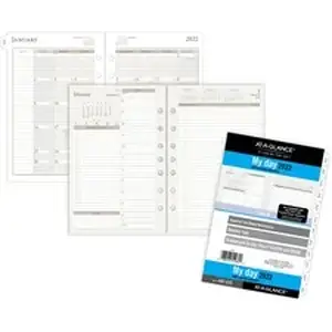 For more planning space, this daily refill set lays out each day across two pages with hourly appointment blocks and full page diary. Monthly overviews are also included for your convenience. Dated planning pages range 12 months from January to December. High-quality paper features superior ink bleed-resistance. Two-page-per-day spreads include hourly appointments from 8 AM to 7 PM, space to list priorities, track expenses and a full diary page for notes. Tabbed, two-page-per-month spreads feature ruled daily blocks for detailed planning and a column for notes. Desk-size (size 4) pages measure 5-1/2" x 8-1/2" and are pre-punched for use in a seven-ring planner binder (sold separately).