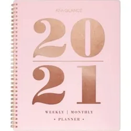 Fashion and organization combine in this stylish weekly/monthly planner from the AT-A-GLANCE Solid Collection. Soft blush pink complements the brilliance of rose gold foil stamping that accentuates the year. Dated planning pages range 13 months from July to July. High-quality paper features superior ink bleed-resistance. Two-page-per-week spreads offer ruled daily entries from Monday to Sunday plus a Notes & Ideas section to jot down reminders and to-dos, count of days/days remaining and holidays. Two-page-per-month spreads feature unruled daily blocks, notes space and past and future months reference. Each month is tabbed in rotating colors for easy access. Special pages include one future planning, four contacts and six notes. Double-sided poly pocket stores loose sheets. Rose gold twin-wire binding keeps pages securely together and lets the planner lie flat. Interior 8-1/2" x 11" pages feature a clean font printed in a rotating complementary palette.