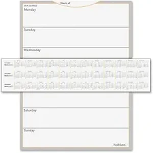 Turn your office walls, doors and other spaces into a dry-erase planning and note-taking center, instantly. This dry-erase planning surface offers a one-week, undated grid to customize your planning. Large, unruled daily blocks provide plenty of space that can be used for a variety of purposes. The weekly format also includes Monday-through-Sunday scheduling and a place at the top to write the date range of the week. This erasable planning surface is easy to use and goes up in seconds. Simply peel and stick the self-adhesive backing on any hard flat surface. Setup requires no tools or hardware and causes no damage to wall surfaces. Remove with no adhesive residue. WallMates Dry-erase Weekly Planning surface includes a self-adhesive, three-year reference calendar and dry-erase marker.