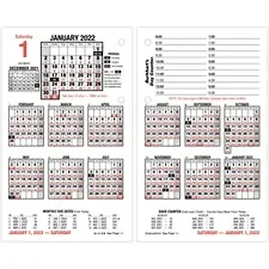 Stay up-to-date and organized with this Daily Desk Calendar Refill for E58-style bases. Two-page spreads include half-hourly appointments and open writing space. Daily refill calendar pages let you organize your schedule and view it at a glance. Dated planning pages range 12 months from January to December for a full year of planning. One day stretches over two pages with ruled appointment times on one side and open planning space on the other. Half-hourly appointment times run from 7 AM to 5 PM for detailed scheduling. Two-hole punched refill also includes current, past and future months reference for quick date-checking and future planning.