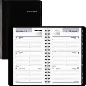 Compact planner will help keep you organized and on schedule with easy planning on the go. Dated planning pages range 12 months from January to December. Weekly appointment book also features two-page-per-week spreads, a tabbed telephone/address section and simulated leather cover. Each spread includes ruled daily blocks, hourly appointment times from 8 AM to 5 PM on weekdays, Monday-through-Sunday scheduling, count of days/days remaining, a two-color format in black and blue ink, and current and future months reference. Planner also offers concealed wire binding and tabbed telephone/address section.