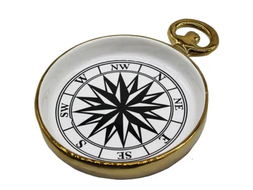 Elevate your decor with this Elegant Pocket Watch Trinket Tray, perfect for your entryway or nightstand. This charming ceramic tray features a beautifully painted compass design on the bottom, seamlessly blending style and functionality. The gold-dipped edge adds a touch of sophistication to any space.