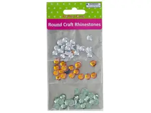 Make craft projects shine with these Faceted Round Craft Rhinestones featuring colorful acrylic gems with silver color backings. Rhinestones come in clear, golden yellow and light green. Rhinestones measure approximately 0.375" in diameter. For ages 3 and up. Comes packaged in poly bags with a header card.